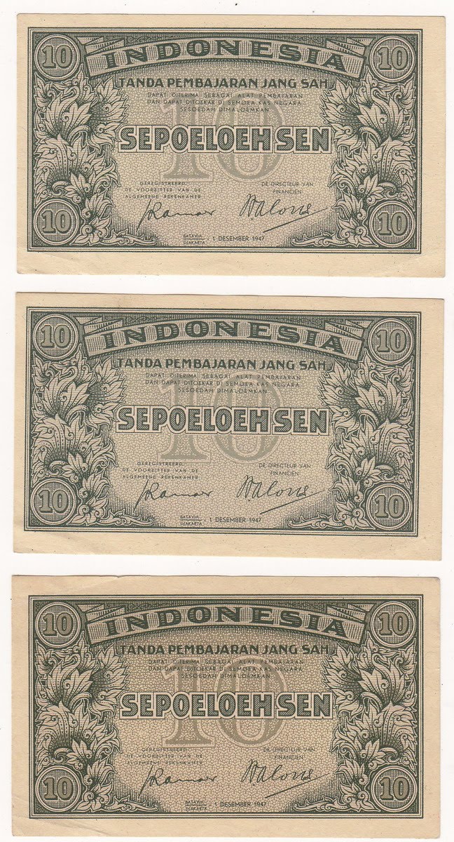 SEPOELOEH SEN, Uang kertas Indonesia. 1 Desember 1947 Batavia/Djakarta. Kondisinya masih sangat baik, tidak terlipat. Dijual Rp. 60.000,- ( untuk 3 lembar )